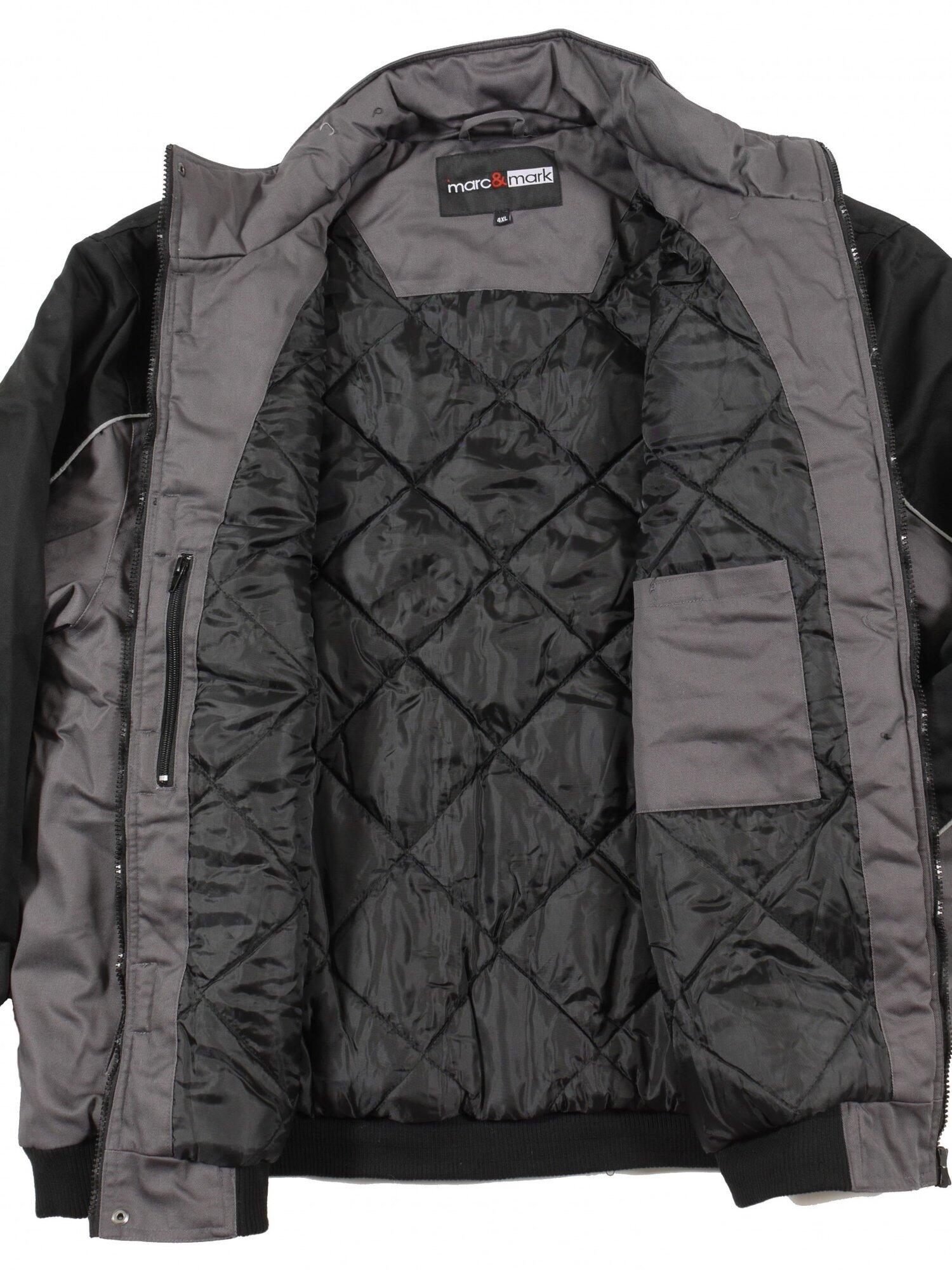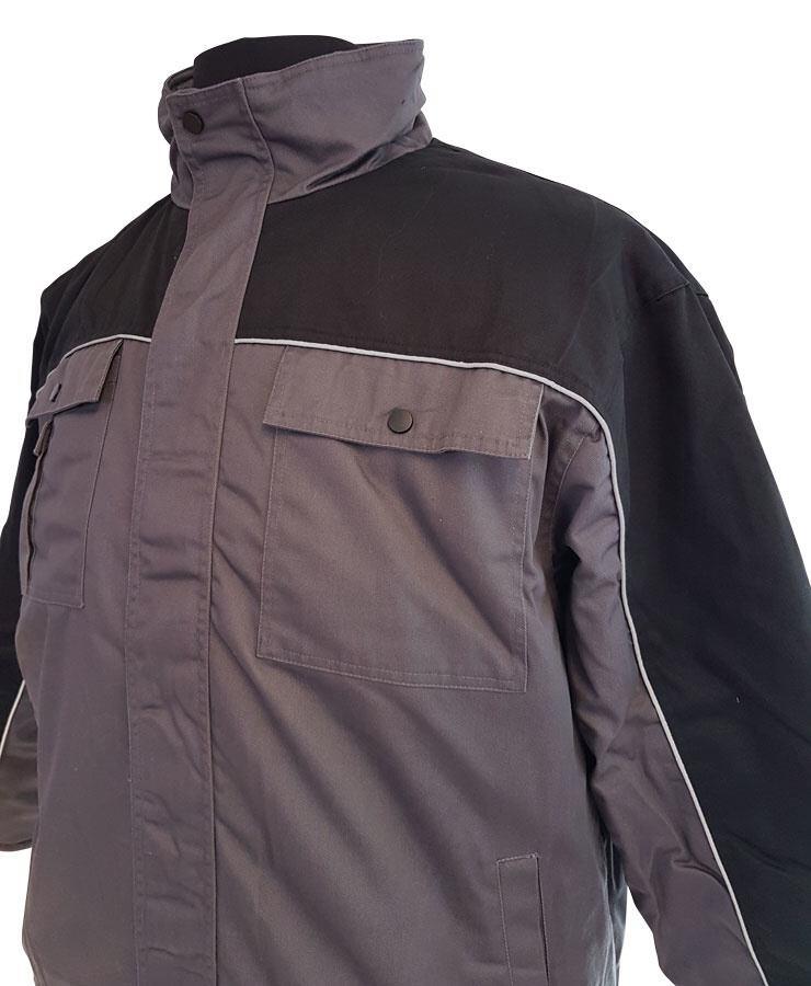 Arbeidsjakken er i fargen koksgrå og har svart kontrastfarge på ermene, skuldrene og den øverste delen av brystet og ryggen. I tillegg er ribbekanten også svart. Denne arbeidsjakken i store størrelser for menn har mange lommer og ulike detaljer.