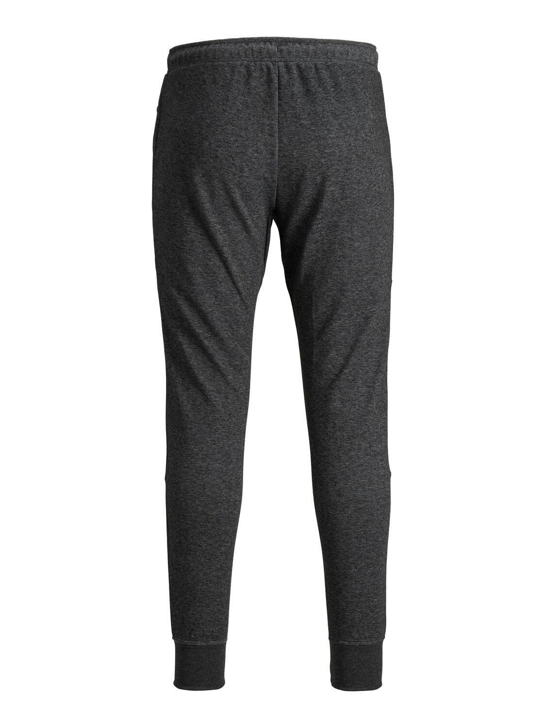 Koksgrå melerte joggebukser fra Jack & Jones. Det er et par behagelige og myke bomullsbukser med lav, elastisk midje. Joggebuksene har ribbekanter ved anklene, og passformen sitter tett over ben og knær.