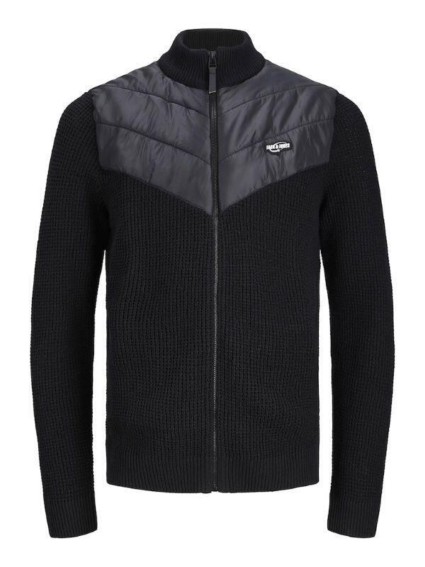 Svart strikket cardigan, kombinert med dynejakkepanel på brystet.