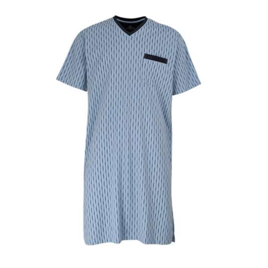 Lang nattrøye/nattskjorte med korte ermer for menn fra Götzburg. Denne nattrøyen er blå med helprintet mønster. Den har splitt i sidene og V-hals med navyblå kant.