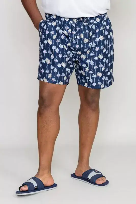Navyblå badeshorts fra D555. Det er "palme"-print på shortsene i mange flotte farger.