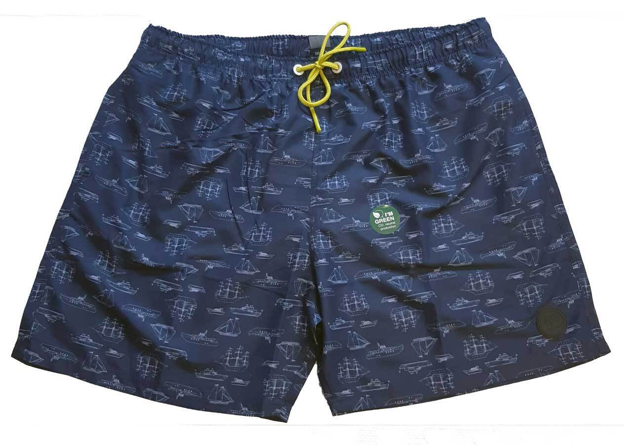 Navyblå badeshorts fra Ceceba. Badeshortsene har print av ulike skip. Det er to skrålommer foran og en baklomme med borrelåslukning.