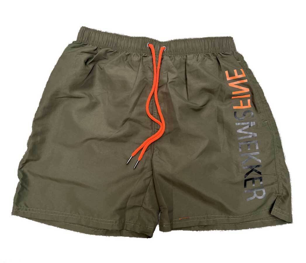 Olivenfargede badeshorts til menn fra Finesmekker. Ned langs venstre bukseben står det Finesmekker med svart og oransje skrift. Det er også oransje kontrast på innsiden av livet.