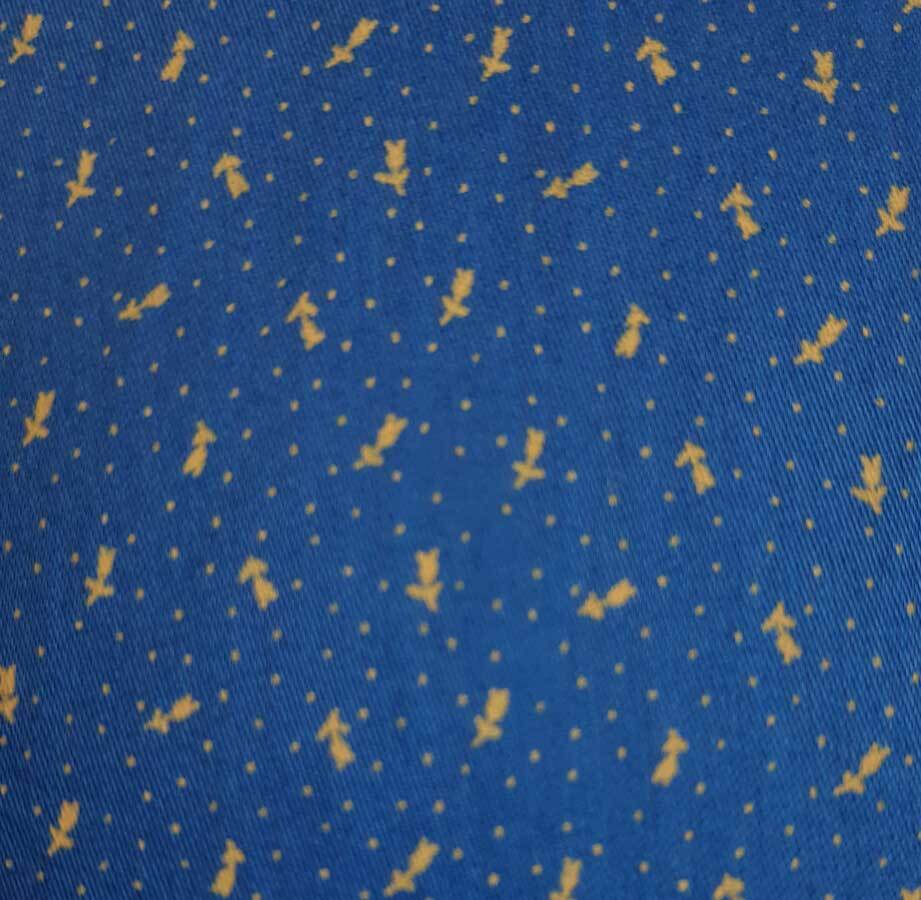 Flott blå skjorte fra Kamro. Skjorten har lange ermer og et mønster bestående av små gule prikker og blomsterlignende print.