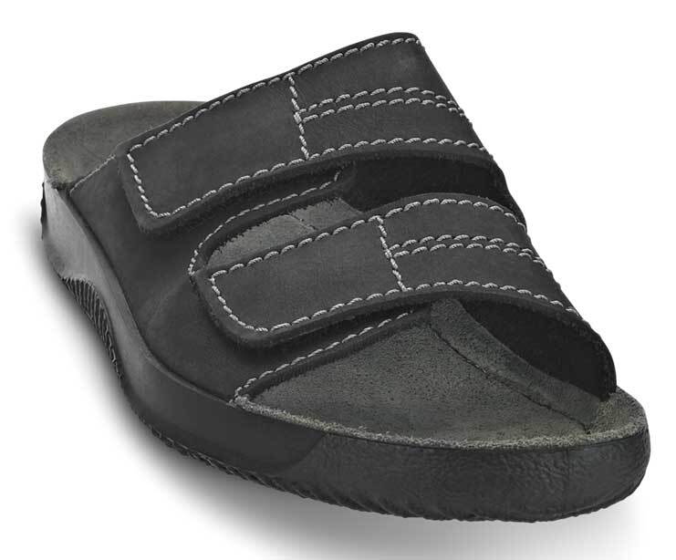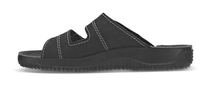 Denne brede herresandalen fra Rohde er det opplagte valget når du vil ha både komfort og fleksibilitet. De to justerbare velcroremmene gjør det enkelt å tilpasse sandalen til føttene dine – perfekt når de blir varme eller hovner opp etter en lang dag. Velcroremmene er også ideelle hvis du trenger litt ekstra plass, eller bare foretrekker en romsligere passform. Sandalen er svart med elegante hvite sømmer, som gir et stilrent uttrykk. Den grå innersålen gir god støtte, mens yttersålen med rillemønster sikrer et sklisikkert grep.
