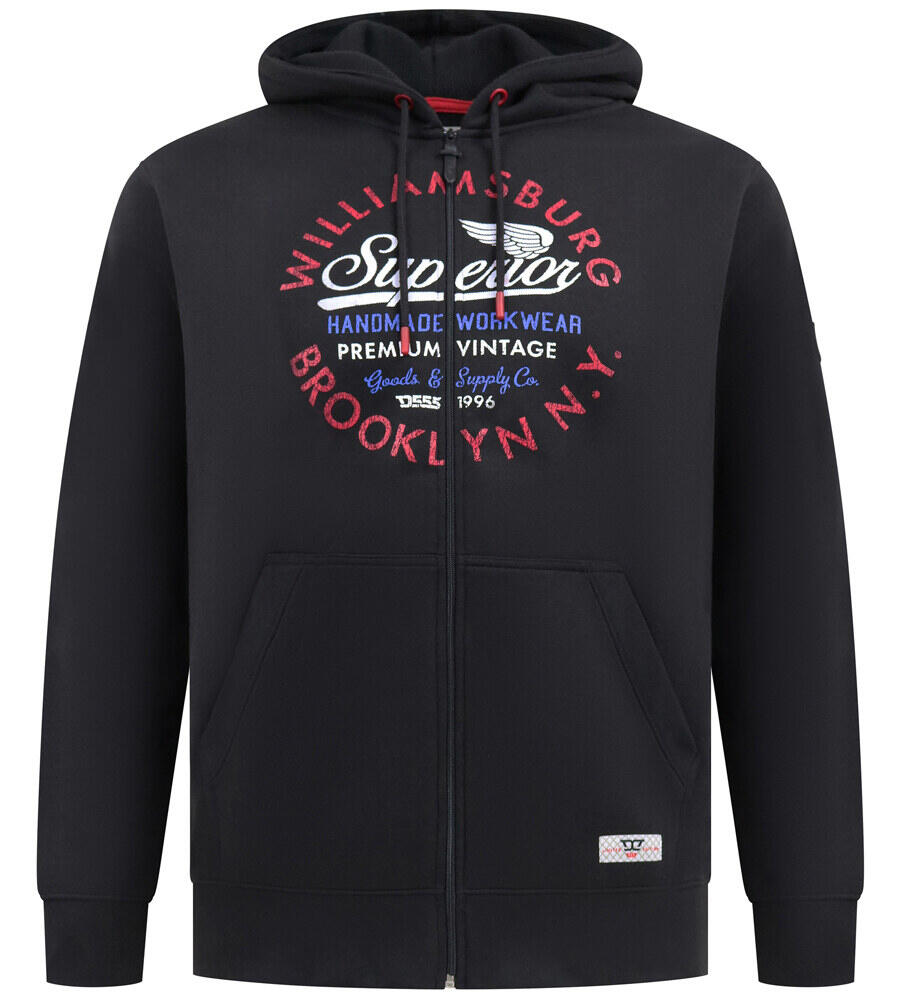 På brystet finner du et stort print i rød, hvit og blå med teksten “Williamsburg Superior Brooklyn N.Y.”, som gir hettegenseren et sporty og urbant uttrykk. Ribbekanter ved ermene og nederkanten sikrer en god passform, mens de gjennomførte detaljene fullfører designet.