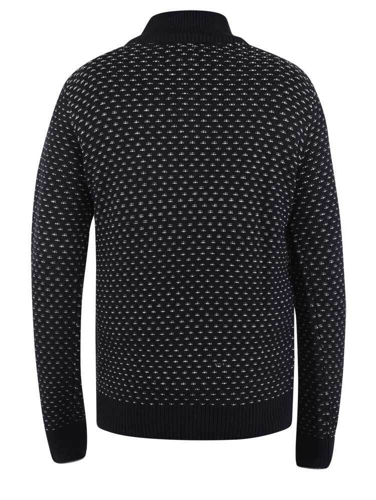 Marineblå strikkegenser fra D555 med glidelås i halsen. Genseren har et vintertrykk i hvitt og rødt med reinsdyr og graner.