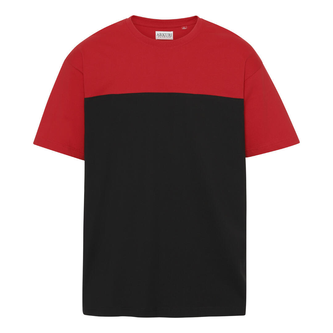 2-farget T-skjorte med rund hals fra ARKURI Fashion. Den øverste delen av T-skjorten er rød og kroppen av T-skjorten er svart.
