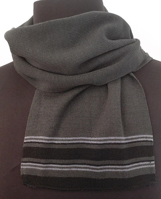 Et lekkert skjerf / halstørkle i grønn/grå med svart og grå kontraststriper i endene.