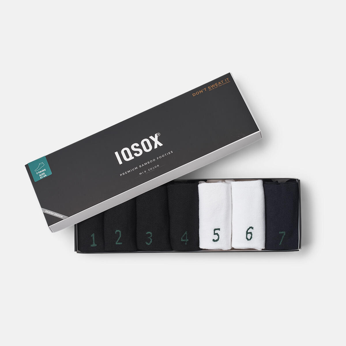 Denne mix-boksen inneholder 7 par nummererte bambus Footies - 4 par sorte, 2 par hvite og 1 par navy.